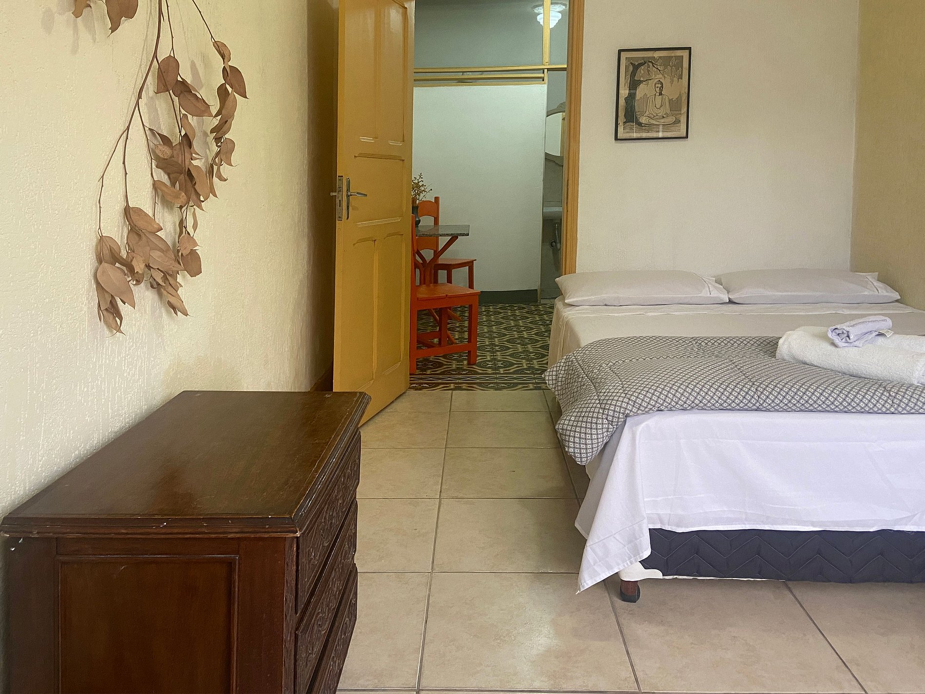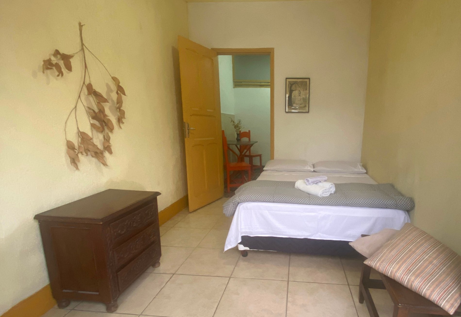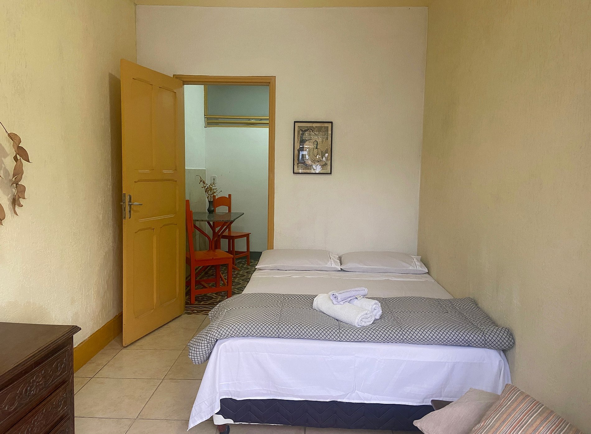 Espaço simples, porém bem acolhedor e cuidadosamente preparado para receber os hóspedes com carinho e atenção aos detalhes. Dispomos de uma cama de casal, lençóis, travesseiros e roupas de cama e edredons de qualidade, além de toalhas de banho e rosto para sua estadia. O ambiente conta ainda com um pequeno armário, criado-mudo, Wi-Fi, ventilador e mesa de jantar/trabalho.