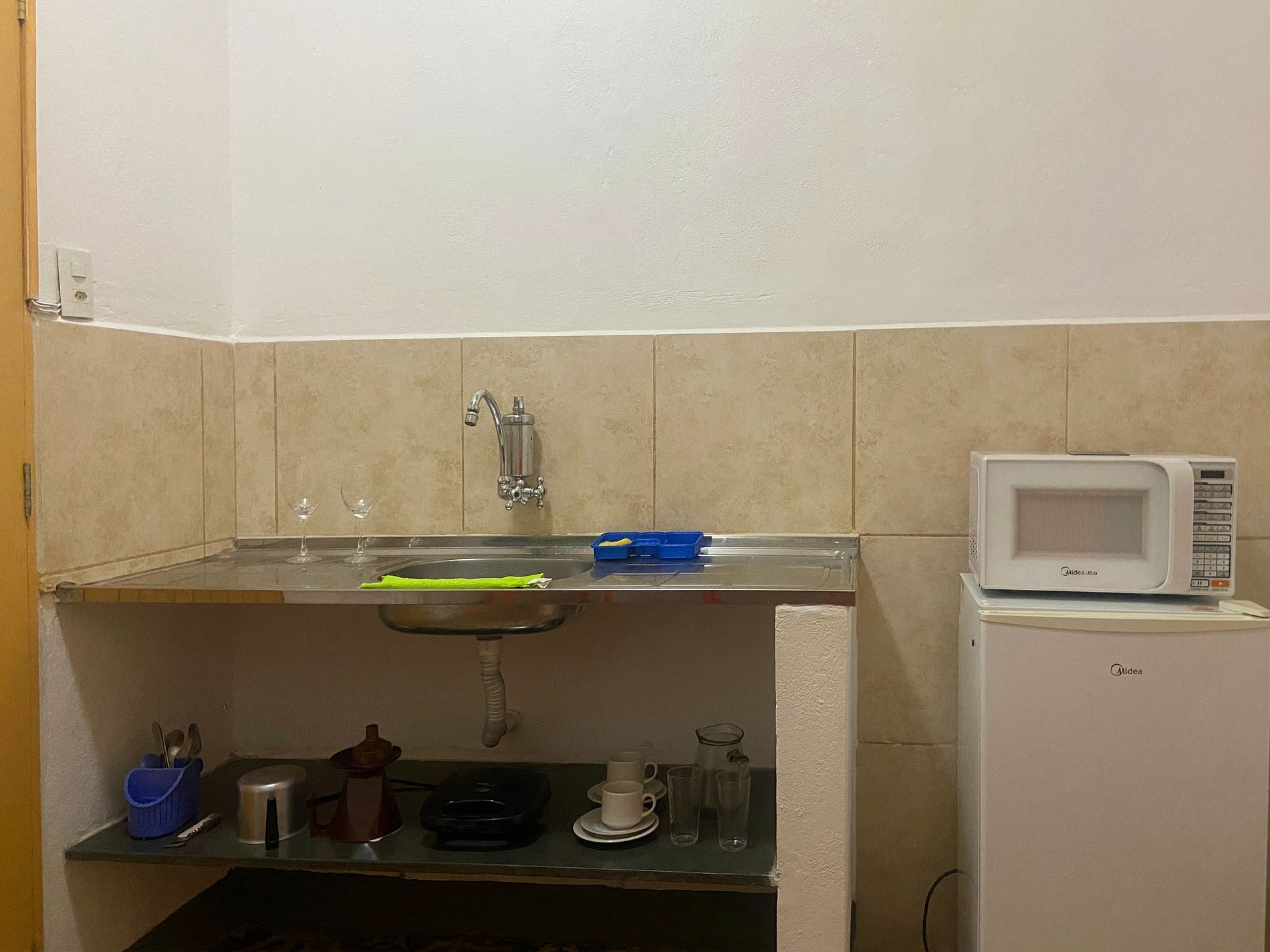 A cozinha é compacta e bem equipada, com utensílios essenciais para preparar lanches rápidos. Possui frigobar, sanduicheira, micro-ondas, xícaras, copos e taças de vinho — tudo pensado para o seu conforto.